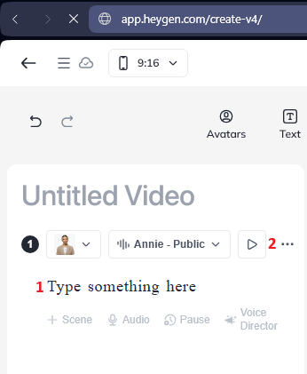 Navigate to https://app.heygen.com/create-v4, enter any text you like 1 and click the play button 2 to ensure that TTS generation is active and working for your account.