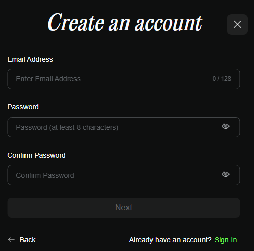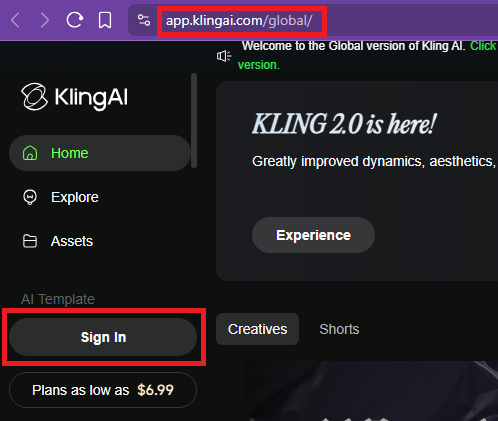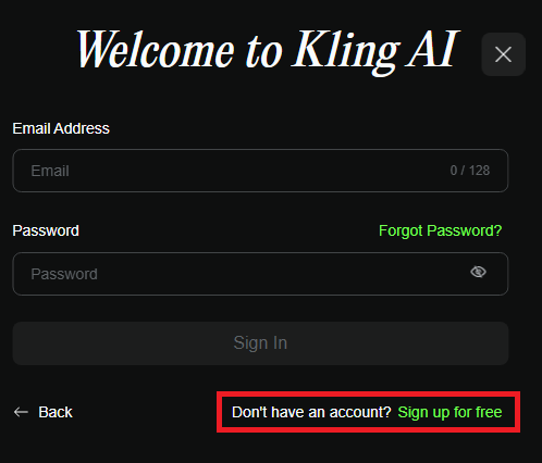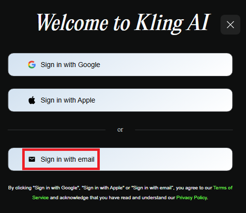 Navigate to https://app.klingai.com/global/ and sign up with an email account. Our API does not support Gmail or Apple accounts. We strongly recommend creating a separate Kling AI account designated for API work.