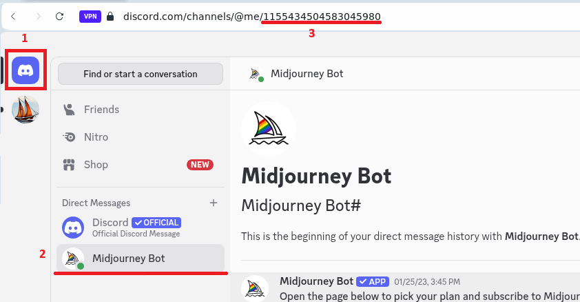 If you have trouble locating the Midjourney Direct Messages channel, refer to the official documentation.