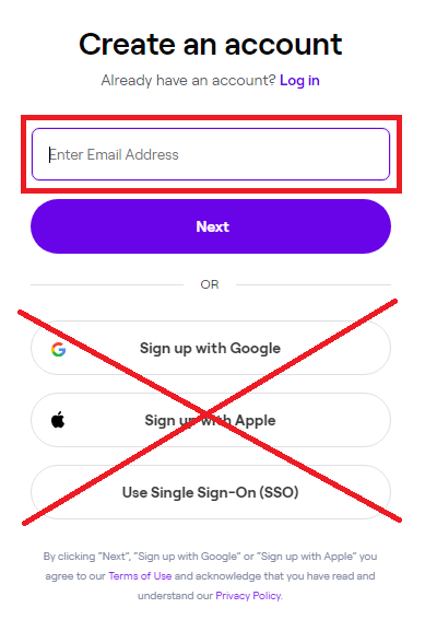 When creating a new account, choose the email option. The API will not work with accounts created using Sign up with Google, Sign up with Apple, or Use Single Sign-On (SSO) options.